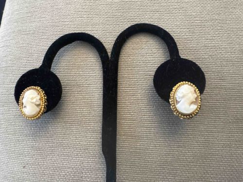 A pair of vintage oval-shaped clip-on earrings featuring classic shell cameos set in a yellow gold-toned metal frame. Each earring depicts a finely carved right-facing female profile with intricate hair detailing. The cameos appear to be carved from a natural cornelian or similar shell, showcasing a subtle characteristic white-to-peachy-tan color gradient. The setting features a decorative rope or beaded border, a design element common in mid-20th-century costume or fine jewelry. While the high-shine finish of the metal suggests a gold plating or high-karat gold, no hallmark is immediately visible in the frontal view. The carvings exhibit a moderate level of detail, particularly in the tresses of hair and the facial structure, indicating careful craftsmanship. The condition is excellent with no visible chips to the shell or significant tarnish to the metal, though a minor patina is expected given their estimated age (likely mid-20th century, circa 1950s-1960s). These earrings represent a classic Victorian-revival style that was popular for its timeless elegance.
