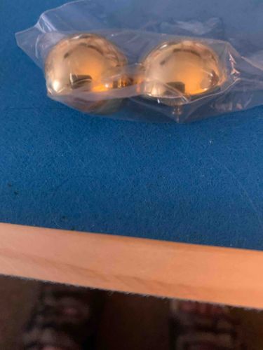 This item consists of a pair of identical spherical objects, likely decorative finials or hardware knobs, appearing to be crafted from polished brass or a high-shine gold-toned metal alloy. Each sphere is approximately 1 to 1.5 inches in diameter, exhibiting a mirror-like finish that suggests a modern manufacturing process, possibly machine-lathed or cast then electroplated. The surface is highly reflective, capturing surrounding light with a warm, golden hue. They are currently stored in a clear heat-sealed plastic bag, which indicates they are likely contemporary, mass-produced items or new-old-stock replacement hardware rather than antique or artisanal pieces. No visible maker's marks or stamps are discernible through the packaging, which is typical for standard utilitarian hardware. The condition appears to be 'new' or 'mint,' with no evidence of surface oxidation, tarnish, or mechanical wear, as they are protected by the sealed film. The construction is uniform and symmetrical. While they lack the characteristic patina of aged brass, their heavy appearance suggests a solid metal build rather than hollow plastic. They could serve as decorative ends for small rods or as contemporary furniture pulls.