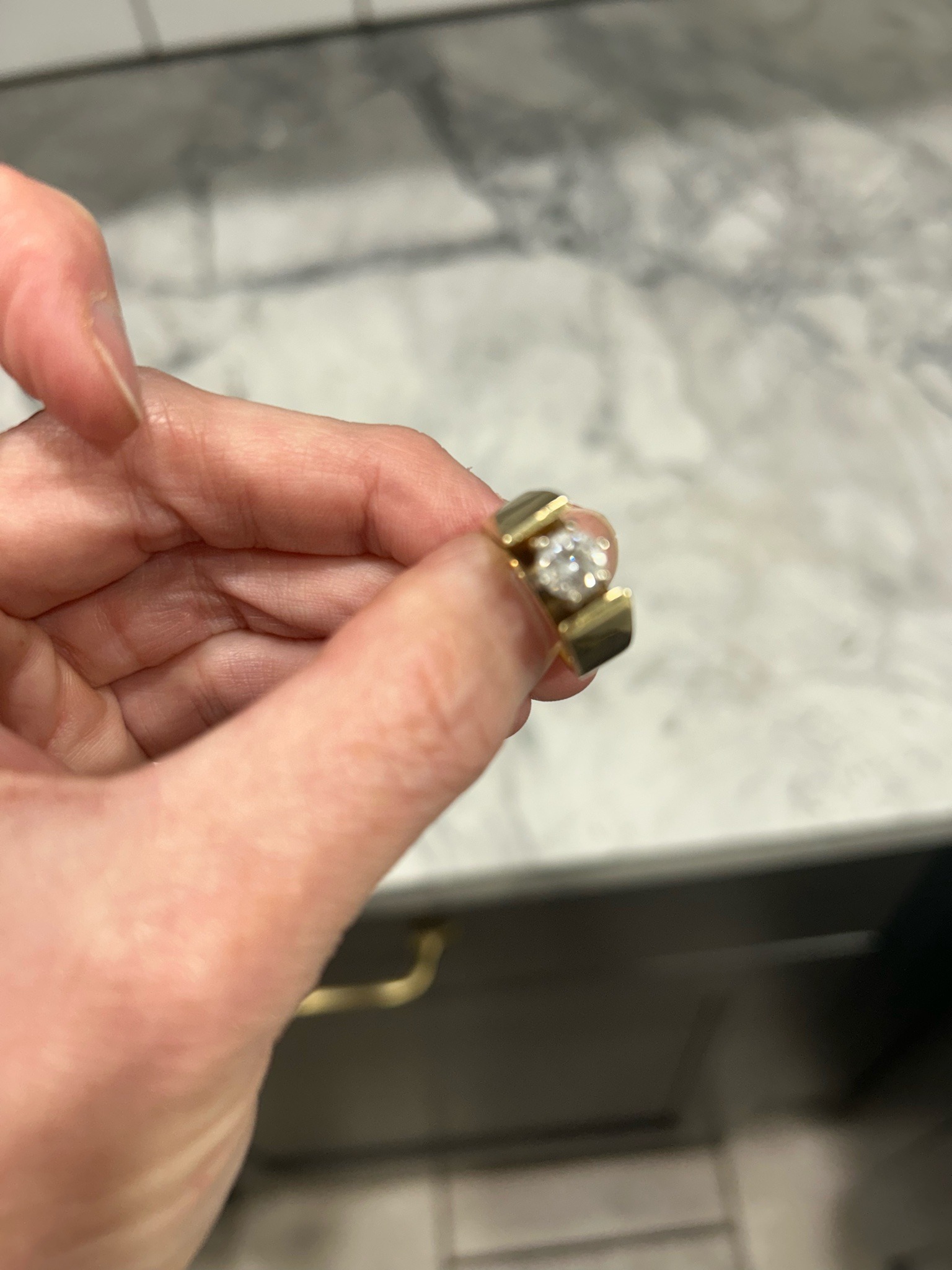 This is a contemporary fine jewelry ring featuring a center round brilliant-cut colorless stone, likely a diamond, mounted in an architectural tension-style setting. The shank is crafted from a polished yellow metal, consistent in appearance with 14k or 18k yellow gold. The band features a wide, flat profile with a substantial thickness, tapering slightly toward the stone. The metal wraps around the stone to hold it in place by compression rather than traditional prongs, creating an open-profile look that allows light to enter the stone from all angles. The diamond appears to be approximately 0.75 to 1.25 carats based on visual scale, with a high degree of fire and brilliance visible despite the photo's blur. Regarding condition, the metal exhibits a soft patina of light surface scratches and micro-abrasions consistent with regular wear, particularly on the outer flat surfaces of the band. No major dents or deep gouges are visible. The craftsmanship demonstrates high precision, characteristic of modern late-20th to early-21st-century jewelry design. While no maker's marks are visible in this orientation, this style is synonymous with high-end designers like Niessing or Steven Kretchmer. The overall aesthetic is minimalist, masculine, and sophisticated.