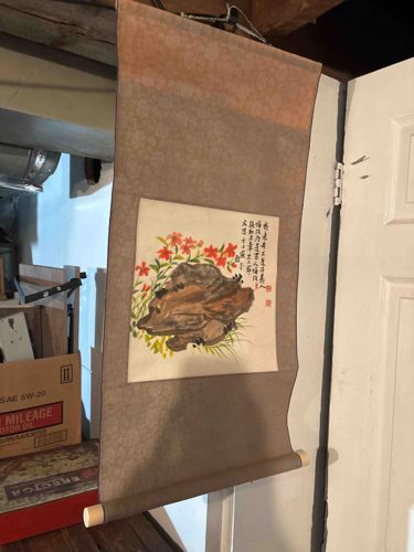 This is a vertically oriented Chinese hanging scroll (kakejiku) featuring a central ink and wash painting on paper, mounted onto a silk-patterned textile border. The core artwork depicts a 'Scholar's Rock' or 'Taihu stone' rendered in expressive brown and grey ink washes, surrounded by vibrant red azalea flowers and green foliage. The painting includes a vertical column of Chinese calligraphy in the upper right quadrant, detailing a poetic inscription or dedication, accompanied by two vermilion artist seals. The mounting consists of a grey-brown brocade fabric with a subtle floral or geometric pattern, characteristic of traditional 20th-century mounting styles. The bottom is weighted with a wooden roller bar featuring light-colored decorative ends. Physically, the piece appears to be in fair to good condition, showing some surface undulations and horizontal creasing consistent with being rolled for storage. There is visible fading and oxidative yellowing of the paper substrate, often referred to as 'foxing' or age-toning. The craftsmanship reflects a traditional 'xieyi' (freehand) style common in the mid-to-late 20th century. Notable condition issues include minor fraying at the edges of the silk mounting and some dust accumulation from long-term storage in an unfinished environment.