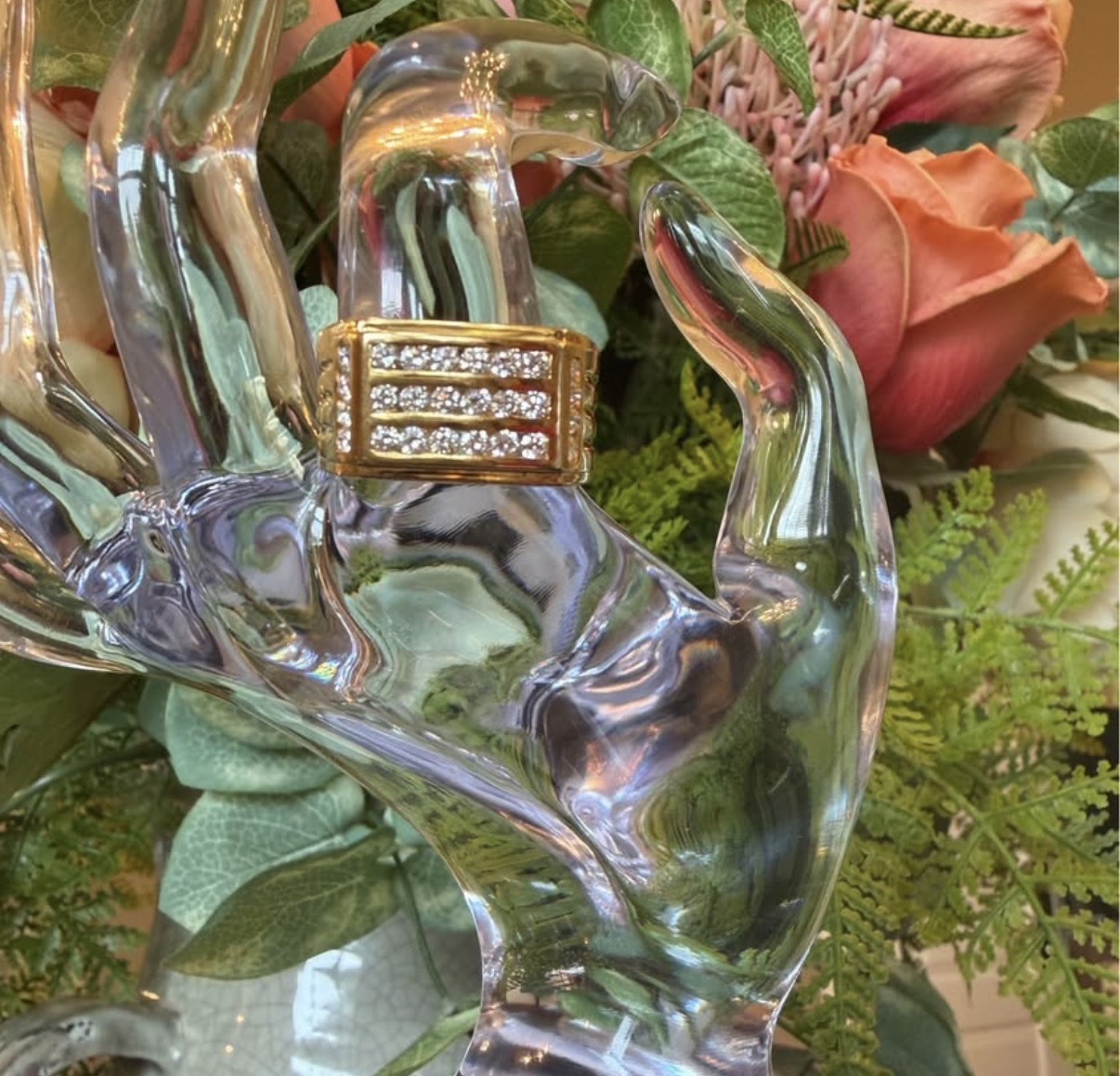 This is a contemporary men's band ring, size 9, meticulously crafted from 925 sterling silver with a heavy gold plating, commonly referred to as gold vermeil. The ring features a substanial total weight of approximately 9 grams, giving it a heavy and luxurious feel on the finger. The face of the ring is a wide rectangular table set with three horizontal rows of brilliant-cut lab-grown diamonds, totaling approximately 1 carat in weight. The stones are densely packed in a pave-style setting within a raised border, maximizing their collective brilliance and fire. The shoulders of the band exhibit vertical grooved detailing, adding a modern architectural flair to the design. Based on its construction and material composition, this piece is likely of modern manufacture, reflecting a classic yet bold hip-hop or 'executive' aesthetic. The condition appears excellent with a high-polish finish on the yellow gold surfaces and no visible signs of missing stones or significant surface abrasions. The use of lab-grown diamonds provides high clarity and visual appeal characteristic of high-end fine jewelry while remaining ethically sourced. The overall craftsmanship suggests a well-made fashion piece designed for durability and daily wear.