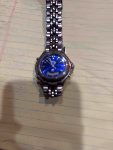This is a men's wristwatch, specifically identifiable as a Seiko Kinetic Arctura model from approximately the late 1990s or early 2000s. The timepiece features a distinctive sunray-patterned cobalt blue dial housed within a circular stainless steel case. The case is integrated into a unique stainless steel 'beaded' or 'pebble' style bracelet composed of five rows of rounded, high-polish links, which is a signature design element of the Arctura series. The dial includes a date window at the 3 o'clock position and an arched power reserve indicator at the bottom (6 o'clock orientation). It utilizes Seiko's Kinetic movement, which generates electrical energy through the movement of the wearer's wrist. Regarding its condition, the watch displays significant signs of regular wear, including numerous micro-scratches and scuffs across the steel bezel and bracelet links. There is visible grime build-up between the articulated links and near the lugs, suggesting a need for professional cleaning. The crystal appears relatively intact but may have light surface abrasions. The crown and side pusher (likely for the power reserve check) are present. The overall construction highlights the industrial-modern aesthetic popularized by designer Jorg Hysek for Seiko during this era.