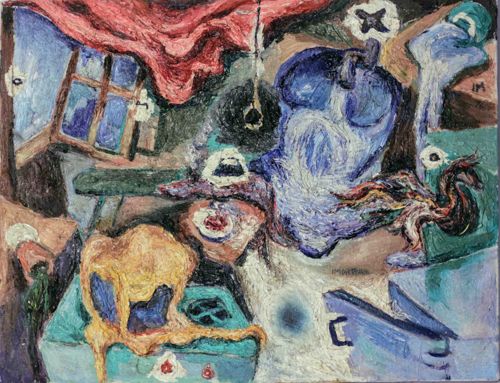 This is a medium-sized oil painting on canvas, characterized by a highly expressive, impasto technique. The composition represents a cluttered interior scene rendered with distorted perspective and a vibrant, somewhat discordant color palette. Dominant hues include deep blues, earthy browns, cadmium yellows, and a striking draped red textile at the top left. The application of paint is thick and tactile, with visible brushstrokes and palette knife marks that create a sense of chaotic movement. Central to the work is a blue, torso-like form that appears to emerge from the background, surrounded by various domestic objects like a window frame, a small stove or appliance, and what looks like a basin. A small monogram or set of initials, possibly 'IM', is visible in the upper right quadrant. The work exhibits a style reminiscent of mid-20th-century German Expressionism or post-war existential art, emphasizing emotional intensity over anatomical or spatial accuracy. Regarding condition, the paint surface appears relatively stable, though some minor cracking and edge wear on the canvas are visible, consistent with a vintage work from the mid-to-late 20th century. The quality of the layering and the confident, energetic brushwork suggest a trained artist working within a Modernist tradition.