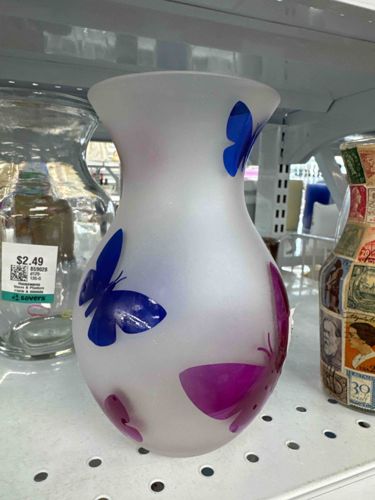 This is a contemporary decorative glass vase featuring a frosted, satin-finish background in a translucent white or pale lavender hue. The vase is designed with a flared rim, a constricted neck, and a bulbous body that tapers toward the base. Its primary decorative feature is a series of applied or high-relief colored glass butterflies in vibrant shades of cobalt blue and violet-magenta. These butterflies appear to hover over the surface, creating a three-dimensional effect. The material is likely molded glass with an acid-etched or sandblasted exterior to achieve the matte frosted texture. There are subtle hints of color bleeding or soft ombré effects in the frost behind the butterfly motifs, suggesting a modern manufacturing technique. The vase exhibits a polished rim and appears to be in good used condition without visible cracks or significant chips, though there is a small pinkish mark or smudge on the upper neck area. This style is consistent with late 20th to early 21st-century mass-market giftware, often inspired by art nouveau aesthetics but produced using modern assembly methods. No maker's marks are visible in the photograph, but the craftsmanship is typical of high-volume decorative glassware shops.