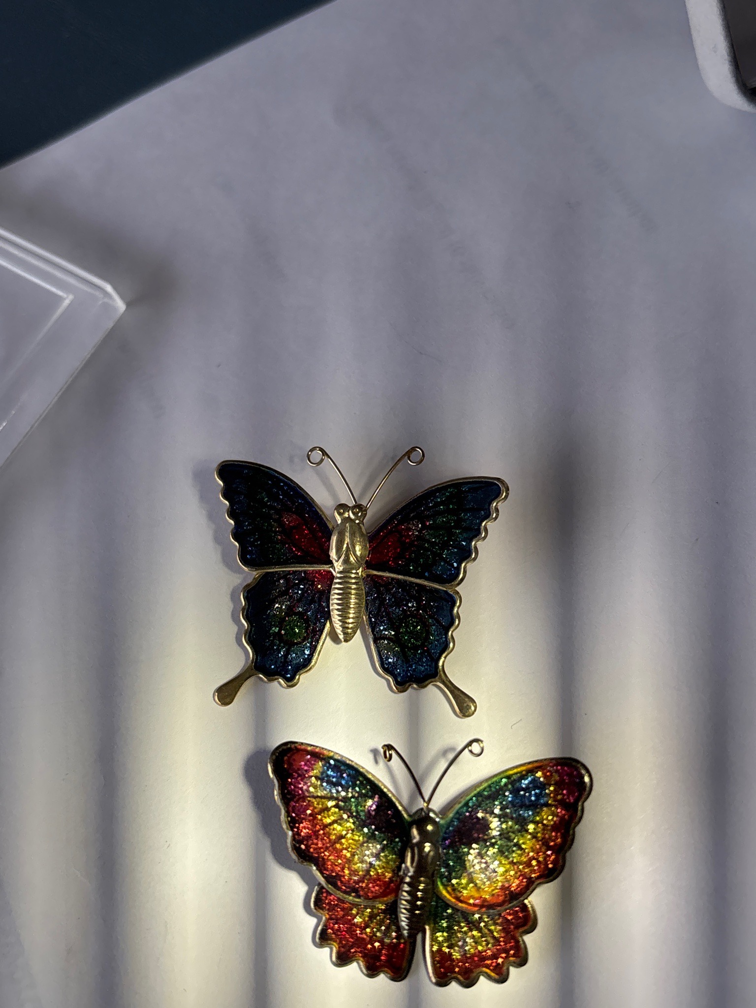 This pair consists of two decorative butterfly brooches, likely dating from the mid-to-late 20th century. The top piece mimics a swallowtail butterfly, featuring a gold-tone metal frame with scrolled antennae and a ribbed central body. Its wings are filled with a dark, glittery enamel finish in deep blue, emerald green, and crimson red, separated by thin gold-tone wires in a style reminiscent of cloisonné. The bottom piece is a more vibrantly colored specimen with rounded wing edges and a similar gold-tone metallic body. Its wings display a brilliant rainbow spectrum of multi-colored glitter enamel, including shades of gold, green, magenta, and blue. Both pieces appear to be in good vintage condition with no visible cracks in the enamel or significant tarnish to the metal, though light surface scratches consistent with occasional wear are present. These items represent classic costume jewelry from the 1970s-1980s era, emphasizing bold colors and whimsical nature themes. There are no maker's marks visible from the front view, though the quality suggests mass-market mid-tier craftsmanship of the period.