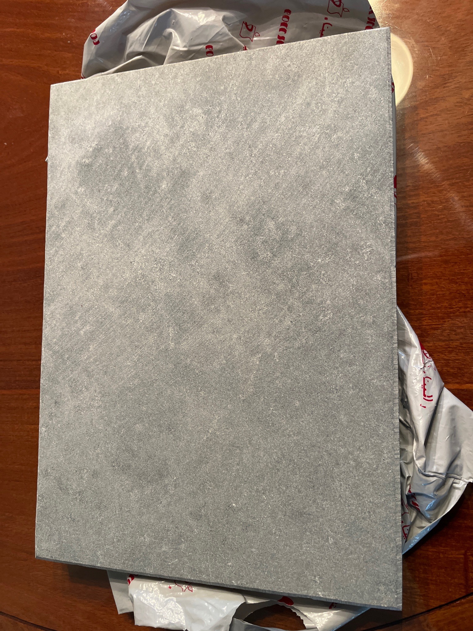 This is a rectangular slab of natural stone, likely a variety of bluestone, slate, or fine-grained limestone, characterized by its consistent blue-grey hue and subtle cloudy texture. The stone displays a matte, unpolished finish with visible surface irregularities that suggest a honed or naturally cleft treatment before being industrially cut. Measuring approximately 12 by 18 inches, the block shows clean, straight edges with slight jaggedness along the right vertical perimeter, indicating a mechanical saw cut rather than hand-tooling. The surface is punctuated by faint white mineral inclusions and a fine-grained crystalline structure typical of sedimentary or metamorphic rock. Notably, there are some scuff marks and white powdery residue on the top left and bottom edges, possibly from transport or the cutting process itself. No visible maker’s marks, signatures, or serial numbers are present on the upward-facing surface. The stone appears to be in excellent contemporary condition with no structural cracks or major chips, resting on modern plastic packaging which suggests it is a relatively new architectural sample or a piece of tiling material.