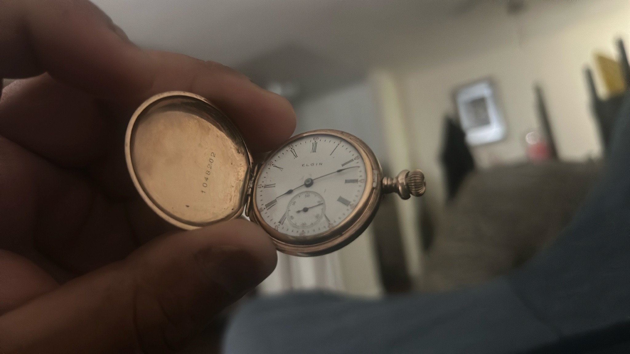 This is a vintage Elgin National Watch Company pocket watch featuring an open hunter-style gold-toned case. The piece is characterized by a circular white porcelain or enamel dial displaying black Roman numeral hour markers, a sub-dial for seconds at the six o'clock position, and thin spade-style hands. The brand name 'ELGIN' is clearly printed below the twelve o'clock position. The case appears to be gold-filled or brass, showing a warm yellowish patina consistent with age. On the interior of the hinged front cover, a stamped serial number '1048202' is visible, which is a critical identifier for dating the case. The watch features a classic onion-shaped winding crown at the three o'clock position. Regarding condition, the dial shows some minor hairline fracturing or 'crazing' near the edges, and the hands exhibit slight oxidation. The case shows surface scratches and common wear from handling, but no major dents or structural failures are immediately apparent. Based on the styling and serial number format, this timepiece likely dates from the late 19th to early 20th century, a period during which Elgin was a premier American manufacturer known for durable and high-quality mechanical movements. The craftsmanship is evident in the precise alignment of the hinges and the crispness of the dial printing.