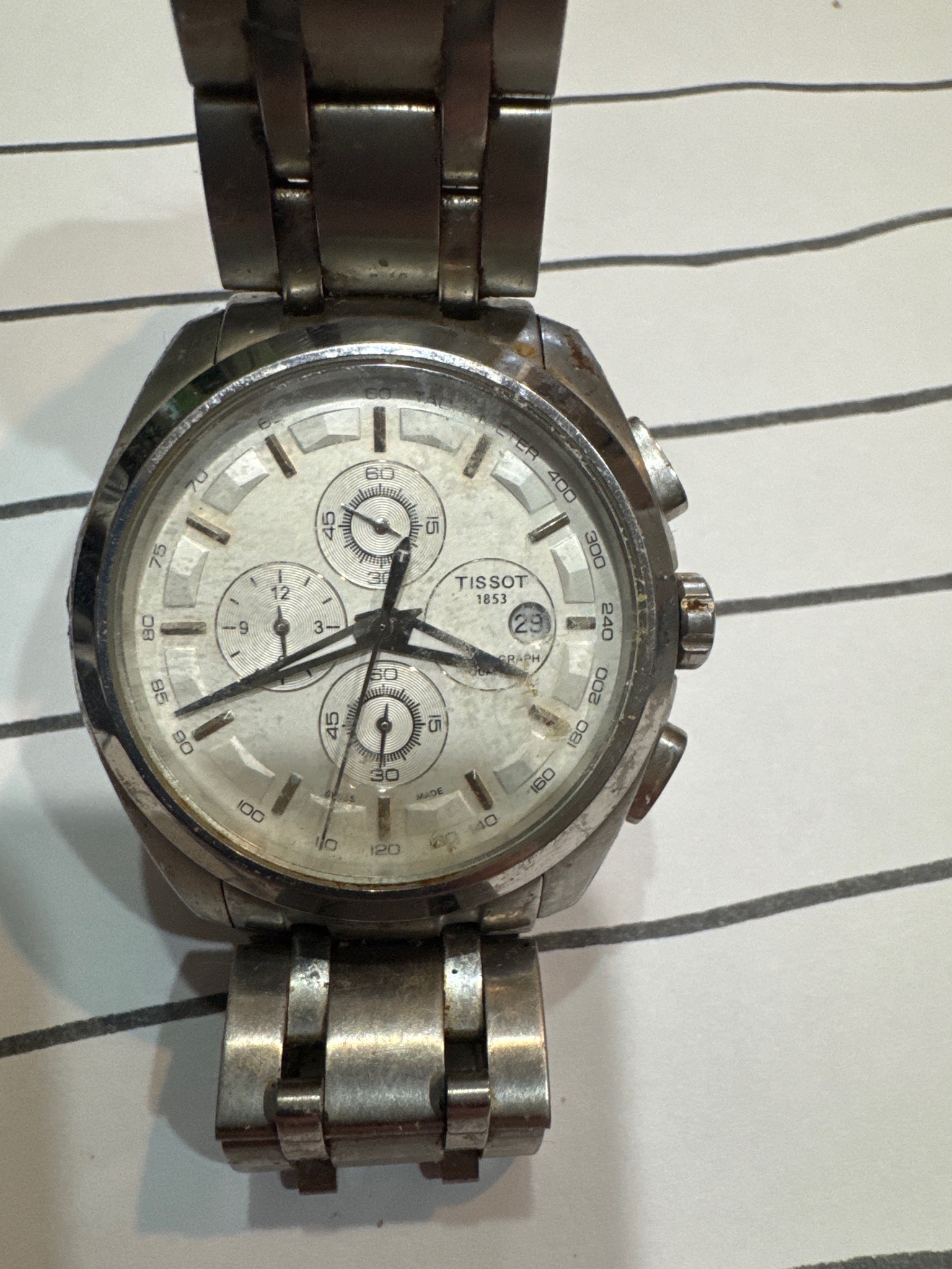 This is a Tissot 1853 chronograph wristwatch featuring a stainless steel case and a matching integrated multi-link stainless steel bracelet. The watch has a silver-tone or light grey dial with a sunray or textured finish, displaying three sub-dials (chronograph registers) at the 6, 9, and 12 o'clock positions. A date aperture is located at the 4 o'clock position. The dial is marked 'TISSOT 1853' and 'CHRONOGRAPH' with 'SWISS MADE' visible at the bottom perimeter. Notable physical features include a tachymeter scale on the inner bezel ring, sword-style central hands with lume inserts, and applied rectangular hour markers. The construction includes a standard crown at 3 o'clock flanked by two push-buttons for the chronograph functions. The condition of the piece shows significant signs of wear and age. There is visible heavy scratching on the crystal, bezel, and case. Significant dirt, grime, and potential oxidation/rust are visible around the lugs, the crown, and the push-buttons, as well as between the bracelet links. The dial shows signs of moisture ingress or spotting under the crystal. The overall patina suggests consistent daily use without recent cleaning or maintenance. It appears to be a modern piece, likely from the late 20th or early 21st century.