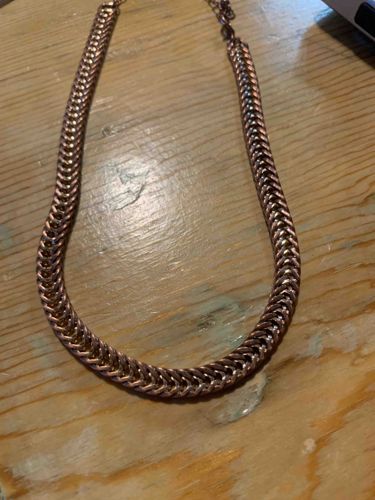 This item is a flat collar-style necklace featuring a prominent chevron or herringbone-inspired link pattern. The piece is crafted from a base metal, likely brass or alloy, finished with a rose gold-tone plating that exhibits a warm, pinkish-copper hue. The construction consists of interlocking, V-shaped metallic scales that create a dense, textured surface with a rhythmic, geometric aesthetic. It measures approximately 16 to 18 inches in length, suggesting it sits near the collarbone. The necklace includes an adjustable extender chain secured by a standard lobster claw clasp, a common feature in contemporary fashion jewelry. Regarding condition, there is visible darkening and patina between the links, which may indicate surface oxidation or the accumulation of dust and biological oils. The plating appears relatively intact across the main body, though there is potential for thinning at high-friction points such as the clasp and ends. Styling suggests a modern or late 20th-century influence, likely mass-produced within the last 15 to 20 years. The craftsmanship is consistent with high-street fashion labels, prioritizing aesthetic visual impact and flexibility over heavy-gauge precious metal construction.