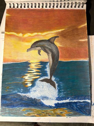 Colored Pencil Drawing of a Jumping Dolphin at Sunset
