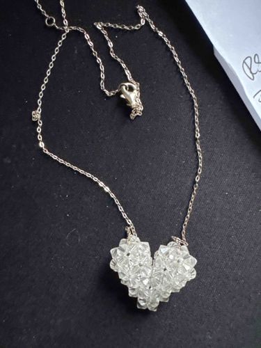 This necklace features a distinctive heart-shaped pendant meticulously crafted through a weaving technique using clear, multifaceted faceted bicone beads, likely crystal or high-quality glass. The heart pendant demonstrates a three-dimensional, structured design with a high refractive index, allowing for significant sparkle when exposed to light. The beads are translucent with no visible structural inclusions or discoloration. It is suspended from a delicate fine-link chain, likely silver-tone or sterling silver, which measures approximately 16 to 18 inches in length. The chain is equipped with a functional lobster claw clasp and a small jump ring for closure. The construction of the heart suggests a contemporary handcrafted style, utilizing bead-weaving patterns common in late 20th to early 21st-century artisanal jewelry. Condition appears excellent with no missing beads, secure threading, and minimal surface oxidation on the metal components. The craftsmanship is precise, showing uniform tension in the weave and symmetrical shaping, which enhances the overall aesthetic value. No obvious maker's marks or hallmarks are visible on the exterior, though they may be present on the clasp mechanism upon closer inspection.