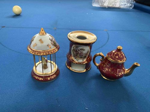 A three-piece collection of decorative porcelain miniatures, likely of French origin in the Limoges style, featuring a rich maroon or burgundy 'Fragonard' courtly love theme. The set includes a miniature birdcage with a bird figurine inside, a teapot with a lid, and a footed vessel or candle warmer base. Each piece is crafted from fine white porcelain and heavily embellished with 22k or 24k gold leaf accents. The decorative motifs include hand-painted or decal-applied scenes of courting couples in 18th-century attire, surrounded by ornate gold floral filigree and scrolling borders. The birdcage features vertical brass-colored wire bars and a domed top with gold floral sprays. The teapot exhibits a classic bulbous form with a gilded handle, spout, and finial. Condition appears excellent with no visible cracks or chips, though minor shelf wear and age-related oxidation on the metallic gilding may be present upon closer inspection. These items likely date from the mid-20th century (c. 1950s-1970s), a period when such souvenir-style miniatures were highly popular as collectible display items.