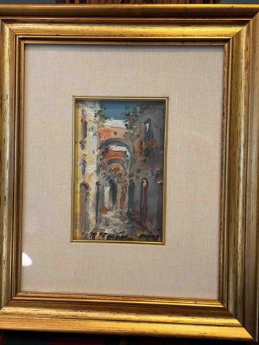 This item is an original oil painting on board or panel titled "Capris" (Capri) by the artist Massimo Federico. The artwork features a vibrant, impressionistic depiction of a narrow Italian street or archway, characterized by heavy, textured impasto brushwork. The color palette centers on earthy ochres, terracotta reds, and soft greys, contrasted against a bright blue Mediterranean sky. The composition utilizes a series of receding arches to create depth within a small format. The painting is signed by the artist in the lower-left corner with a distinct dark script. It is housed in an ornate, deep-set gold-gilded wooden frame with a decorative linen-wrapped liner and a gold-painted inner fillet. The frame demonstrates traditional molding with a slight metallic sheen and minor age-related wear. The artwork appears to be well-preserved without visible paint loss or cracking, though some natural yellowing of the varnish may be present. Estimating a mid-to-late 20th-century origin, this piece exemplifies Italian landscape miniaturism with a high degree of painterly expression and craftsmanship typical of Federico's style. The overall presentation is formal, designed to emphasize the intimate scale of the work.