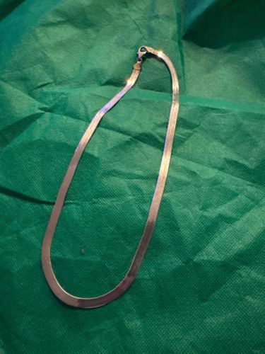 This is a flat herringbone style chain necklace, likely crafted from sterling silver or white gold based on its bright metallic luster. The piece features a liquid-like fluidity characteristic of high-quality herringbone weaves, where interlocking flat metal links are slanted to create a smooth, reflective surface. The chain appears to be approximately 3mm to 5mm in width and roughly 16 to 18 inches in length. It is secured with a traditional lobster claw clasp, which is attached via a teardrop-shaped jump ring and a flat end cap. The construction exhibits a consistent polish across its entire surface, though notable 'kinking' or sharp bends are visible in the upper left quadrant of the chain; these are permanent structural defects common in herringbone chains when they are improperly stored or flexed beyond their limit. The style is classic and minimalist, indicative of late 20th-century jewelry design (circa 1980s-1990s). The craftsmanship is steady, showing uniform link alignment, though the visible bends significantly impact the overall sleek aesthetic and integrity of the piece. No specific hallmarks are legible in the image, but the clasp assembly suggests commercial manufacturing.