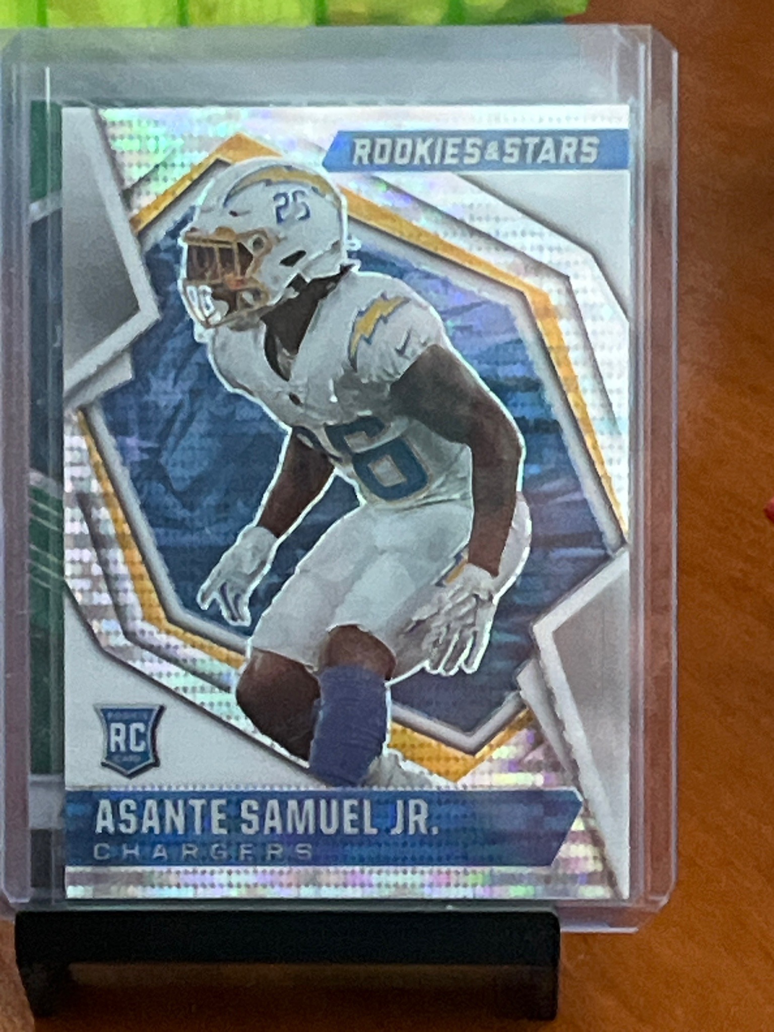 This is a 2021 modern-era football trading card featuring Asante Samuel Jr. of the Los Angeles Chargers. The card is part of the 'Rookies & Stars' set by Panini. It is standard 2.5 x 3.5 inch size, constructed on heavy cardstock with a high-gloss finish and a refractive holographic 'Prizm' or 'Cracked Ice' style metallic foil background that produces a rainbow effect when tilted in the light. The design features a dynamic action shot of the player in a white Chargers uniform with a blue and gold geometric frame. A 'RC' (Rookie Card) shield emblem is prominent on the lower left. The card is currently housed in a transparent plastic top-loader for protection. The centering appears slightly heavy toward the right edge. No major surface scratches or corner dings are visible through the casing, though fine surface scratches are common on these chromium-style finishes. The print quality is high, with sharp lettering for the player name and team name at the bottom against a blue gradient bar. The manufacturing details, specifically from Panini America, Inc., would be located on the reverse side. This item represents Samuel Jr.'s debut season in the NFL, typically making it the most desirable year for collectors.