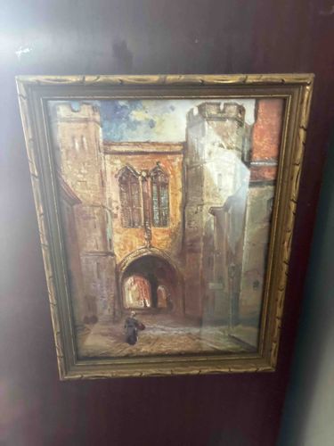 This rectangular framed artwork depicts an impressionistic rendering of a medieval European gatehouse or architectural structure, likely a cathedral entrance or a city gate. The composition features a large stone archway with two flanking crenellated towers, rendered in a warm palette of ochres, browns, and tans, contrasted by a cool, hazy blue sky visible in the upper background. A solitary figure is visible in the foreground, adding a sense of scale to the structure. The painting style is characterized by loose, visible brushwork that suggests texture and light rather than fine detail, placing it likely in the late 19th or early 20th century. The medium appears to be oil on board or canvas, though it is currently protected behind glass. The artwork is housed in a carved, gilded wooden frame featuring a repeated leaf or scale pattern along the outer edge. The frame shows some signs of age-related wear, including minor gilding loss and surface dust. No signature is clearly visible in the provided image, but the quality of light and shadows suggests a skilled artist proficient in architectural studies. The frame construction appears to be mitred corners with a gold-toned patina that enhances the vintage anesthetic. The overall condition appears stable with no major signs of paint flaking or cracking visible from this perspective.