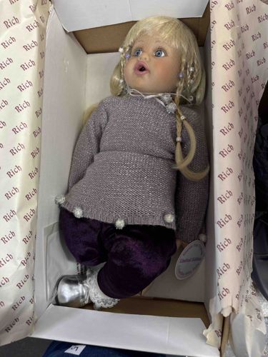 This is a contemporary limited edition collector doll, styled as a young toddler girl. The doll features a bisque porcelain head and possibly partial porcelain limbs with a soft-stuffed body construction. She has realistic blue set eyes, feathered eyebrows, and an open/slack mouth expression. Her blonde hair is styled in a bob with bangs and thin accent braids adorned with decorative pearl-like beads. The doll is dressed in a multi-piece outfit including a purple/mauve marled knit sweater with pom-pom trim, deep burgundy velvet trousers, white lace socks, and metallic silver mary-jane shoes. She is housed in a cardboard shipping or storage box lined with 'Rich' branded tissue paper, and remains attached to a circular 'Limited Edition' hangtag. The craftsmanship reflects late 20th to early 21st-century mass-market artist dolls, commonly sold via television shopping networks or specialty catalogs. The condition appears to be excellent and 'as-new,' likely never removed from the original packaging, with no visible signs of porcelain chipping, fabric staining, or hair degradation. The doll’s specific sculptor is not immediately visible, but the style is consistent with high-volume collectible brands such as those by Marie Osmond or Paradise Galleries.
