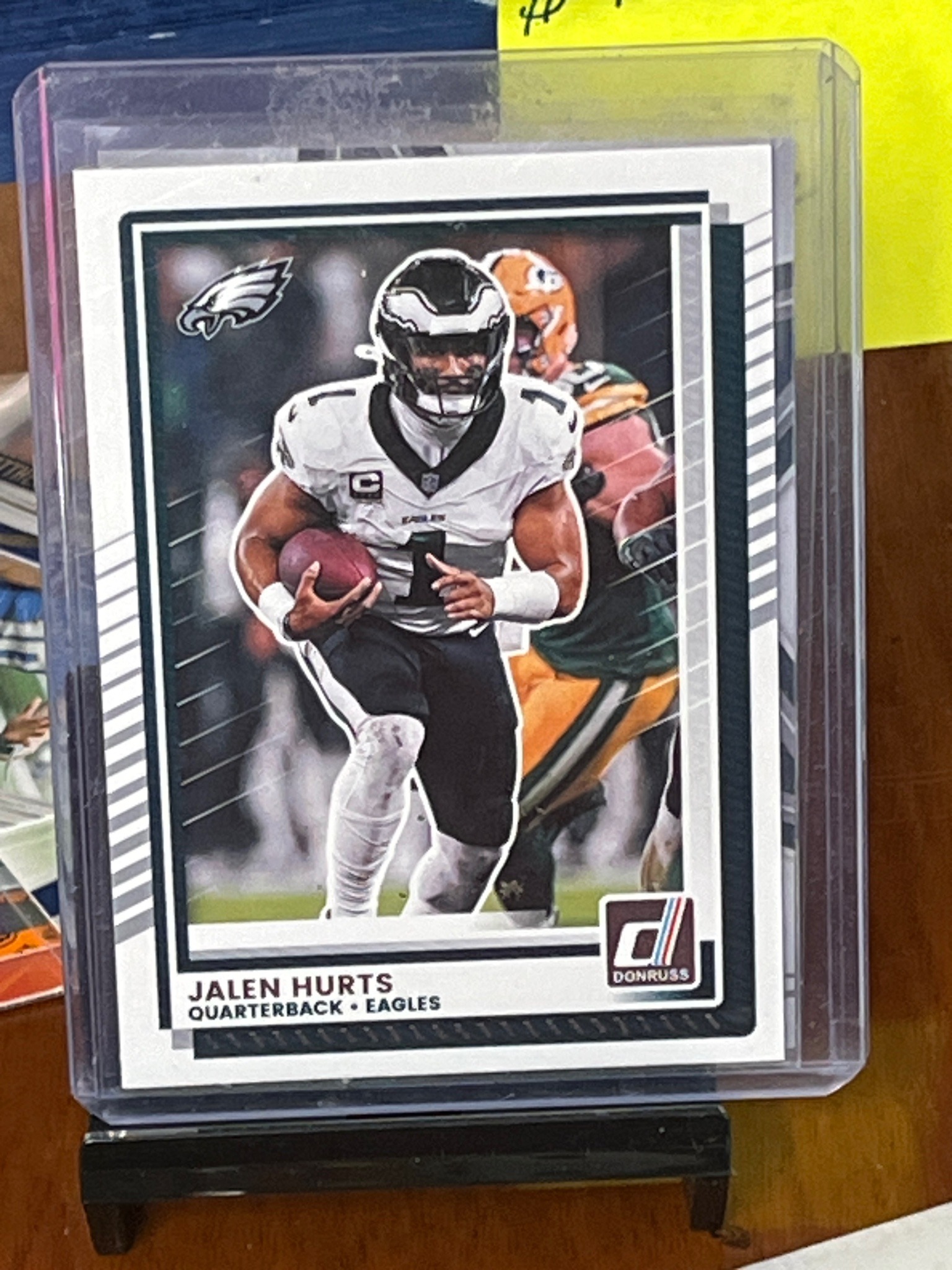 This is a 2021 Donruss series trading card featuring Jalen Hurts, the quarterback for the Philadelphia Eagles. The card is a standard 2.5 by 3.5-inch sports card printed on glossy cardstock. It features an action photograph of Hurts in his white Eagles jersey, carrying a football and scrambling away from a Green Bay Packers defender. The card design includes a white border with a black interior frame, a silver Philadelphia Eagles logo in the upper left corner, and the iconic Donruss 'Rated Rookie' style 'D' logo in the bottom right corner (though this is a second-year base card). The bottom section of the card clearly identifies 'JALEN HURTS' and his position and team as 'QUARTERBACK • EAGLES'. The card is currently housed in a clear plastic protective top loader, which sits on a black display stand. Based on the visual inspection, the card appears to have relatively sharp corners and clean edges through the plastic, suggesting it is in good collectible condition. The centering appears slightly heavy toward the right side, but the colors remain vibrant with no visible surface scratches or fading. As a base card from his second season in the league, it represents a core piece of modern NFL memorabilia from the Panini production era.