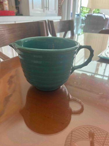 This item is a vintage American Art Deco ceramic batter bowl or large pitcher, manufactured by the Bauer Pottery Company of Los Angeles. The vessel features the iconic 'Ringware' pattern, characterized by concentric horizontal ridges known as rings that wrap around the exterior body Shell. It is finished in a vibrant solid-tone glaze, specifically the celebrated 'Jade Green' or 'Colonial Green' which was a staple of the line. The bowl is constructed with a rounded base, a wide mouth, an integrated pouring spout, and a distinctive 'shark fin' or notched D-form handle which is indicative of the Ringware aesthetic of the 1930s. The piece demonstrates high-quality craftsmanship through its uniform glaze application and balanced proportions. In terms of condition, the glaze appears glossy with no visible cracks or large chips in the photograph, though there are minor surface variations and possible pinholes typical of mid-century firing processes. Based on its design and manufacturing history, this piece likely dates from the 1930s to the 1940s, representing California Colorware at its peak. The sturdy ceramic construction suggests it was intended for heavy kitchen use, though it is now a highly sought-after collectible.