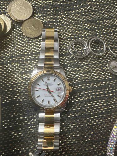 This is a two-tone wristwatch featuring a design heavily inspired by the Rolex Datejust Turn-O-Graph 'Thunderbird' model. The watch is constructed with a stainless steel case and a matching Oyster-style bracelet that incorporates gold-toned center links and silver-toned outer links. The white dial is marked with the Rolex crown at 12 o'clock, baton hour markers, and a date window at the 3 o'clock position magnified by a cyclops lens. A notable feature is the red seconds hand and the rotating fluted bezel with numeric scale markings (10, 20, etc.). Regarding authenticity and condition, there are several red flags visible in the image. The 'Rolex' and 'Datejust' text on the dial appears poorly aligned and lacks the crisp printing found on genuine luxury timepieces. The date magnification on the cyclops lens seems insufficient, and the overall fit and finish of the bracelet links and the crown show signs of lower-tier manufacturing. The gold coloring on the bezel and bracelet appears thin, suggesting a plated base metal rather than solid 18k gold. The watch shows moderate surface scratches and wear consistent with regular use, but the lack of precision in the logo and dial elements strongly suggests this is a replica or an aftermarket homage rather than an authentic vintage or modern Rolex Swiss chronometer.