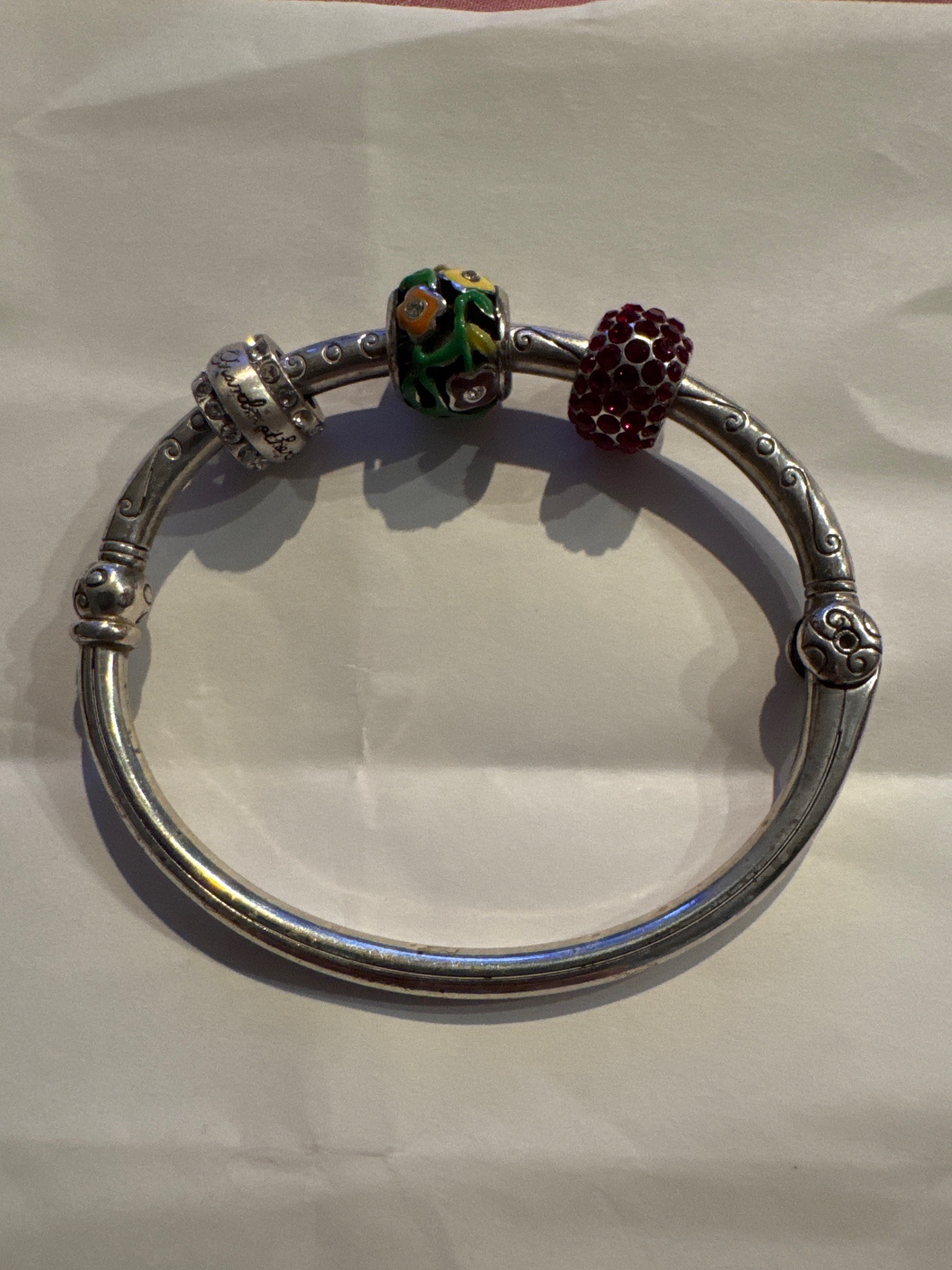 This item is a rigid, hinged bangle bracelet constructed from a silver-colored metal, likely sterling silver or a silver-plated base metal. The bracelet features an oval-shaped profile with a smooth lower half and a decorative upper section embellished with three distinct charms. The first charm is a wide silver-toned band engraved with the word "Grandmother" in a script font, accented by small inset clear stones and beaded edges. The central charm is a rounded bead with an intricate floral cloisonné-style enamel pattern in shades of green, orange, yellow, and black. The third charm is a spherical bead pavé-set with numerous brilliant round red faux-ruby stones. The bangle itself showcases decorative scrollwork and circular motifs near the hinges. Condition-wise, the piece exhibits visible oxidation and tarnish, particularly in the recessed areas of the engraving and metalwork, which is characteristic of aged silver. There are fine surface scratches consistent with regular wear, but the hinges appear functional. This contemporary piece follows the popular 'Pandora-style' aesthetic of the early 21st century, prioritizing sentimental personalization through interchangeable or fixed charms. The overall craftsmanship is consistent with mass-market fine or bridge jewelry found in national retail catalogs.