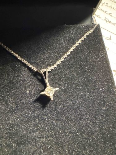 This item is a contemporary white metal pendant necklace featuring a central round brilliant-cut stone, likely a diamond or high-quality cubic zirconia, weighing estimated 0.15 to 0.25 carats. The stone is secured in a full bezel setting at the center of a stylized starburst or cross-shaped mounting. The mounting features four polished tapered rays or points extending outward. The top ray transforms into a split-v bail that threads through a fine-gauge white metal rope chain. The chain's reflective surface suggests a material like sterling silver or white gold. The construction is sleek and minimalist, characteristic of late 20th-century to early 21st-century modern jewelry design. Condition appears excellent with no visible tarnishing or missing hardware, though microscopic surface scratches are typical for pre-owned metal items. The craftsmanship shows clean lines and symmetrical geometry. While no hallmarks are visible in the photograph, they would likely be found on the pendant reverse or the chain clasp. The overall aesthetic is refined and versatile, suitable for daily wear.