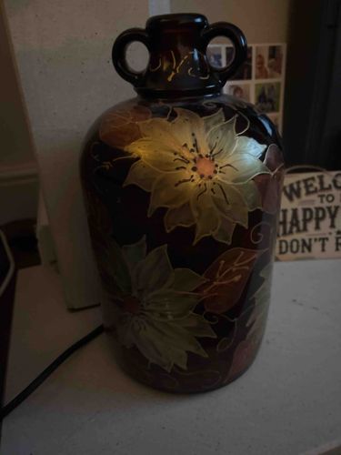 This item is a decorative ceramic vessel or jug featuring a distinctive dark chocolate brown base glaze with comprehensive hand-painted floral motifs. The piece exhibits a bulbous body tapering slightly toward the base, topped with a narrow neck and flanked by two small, symmetrical loop handles at the collar. The primary decorative elements are large, multi-petaled flowers, likely stylized poinsettias or chrysanthemums, rendered in muted shades of pale yellow, sage green, and earthy red-brown. Fine line-work in gold or a light ochre creates delicate tendrils and accents across the surface. The construction appears to be high-quality slip-cast or wheel-thrown stoneware with a smooth, glossy finish. Measuring approximately 10 to 12 inches in height, the piece reflects a mid-20th-century aesthetic, possibly inspired by Japanese Satsuma or European folk art styles. Notable condition details include a light surface patina consistent with age, though no major chips, cracks, or substantial crazing are visible in the provided image. The paint application shows varying levels of translucency, particularly in the yellow petals, indicating a skilled hand-executed decorative technique. This item represents a blend of functional form and ornamental artistry, suitable for decorative display.