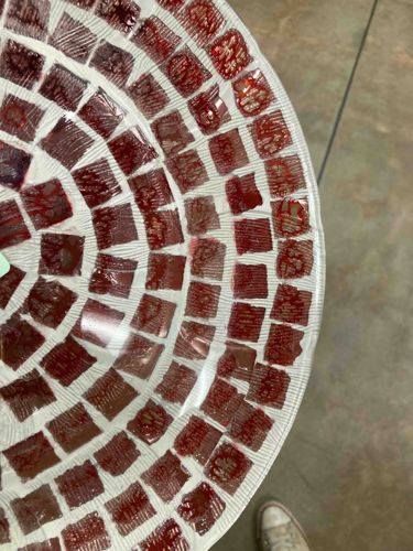 This item is a circular decorative glass vessel, likely a platter or a shallow bowl, featuring a modern mosaic design. The piece is constructed from a clear glass base with a textured ribbing or linear pattern on the underside. The top surface features concentric rings of inlaid glass tesserae in a deep burgundy or oxblood red hue. Each red square has a distinct cross-hatched or 'linen' texture, suggesting they were fused onto the clear glass substrate. The tesserae are arranged with precision, though the slight irregularities in the red coloring and the edges of the squares indicate a handcrafted process rather than mass machine production. The craftsmanship shows a high level of contemporary art glass technique, possibly kiln-formed or fused glass. No visible maker's marks or signatures are identifiable in this view, though such items are frequently produced by studios specializing in decorative glassware from the late 20th to early 21st century. The condition appears excellent with no visible chips, cracks, or surface abrasions, and the edges appear smooth and well-finished. The play of light through the textured clear sections contrasted with the opaque red squares creates a sophisticated visual depth characteristic of high-quality accent decor.