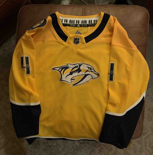 This is a Nashville Predators NHL home jersey from the 'Adidas Adizero' era, circa 2017 to present. The jersey features the team's primary 'Gold' color with navy blue and white accents. The center chest displays the iconic fossilized saber-toothed cat logo in high-quality layered embroidery and twill. A distinctive feature of this specific model is the piano key graphic printed inside the back neckline, a tribute to Nashville's 'Music City' heritage. The jersey is constructed with Adidas's proprietary 'climalite' or 'aeroready' materials, featuring perforated shoulders for ventilation and a textured dimple pattern on the fabric. On the sleeves, the number '4' is visible, suggesting it belongs to a specific player such as Roman Josi (captain) or Ryan Ellis from that era. The NHL shield is positioned at the base of the V-neck collar. The garment appears to be in very good condition with no visible snags, stains, or fraying on the crest or numbers. The stitching exhibits the quality of an authentic retail or team-issued piece rather than a low-tier replica.